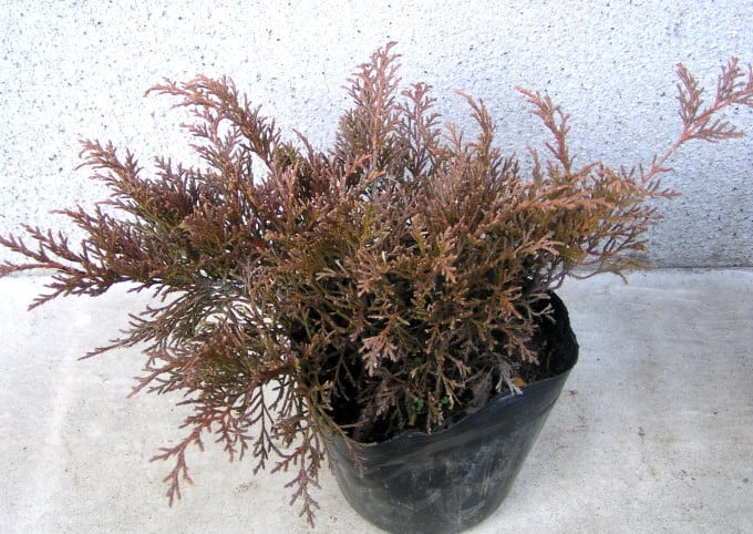 春から秋は緑色で落ち着いた雰囲気ですが、冬はチョコレートのような茶色となるコニファーです。